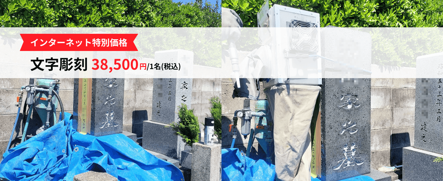 文字彫刻の相場は? 島根県の文字彫刻の相場 約44,000円(税込)~ 福岡県の文字彫刻の相場 約55,000円(税込)~ その他、お墓の立地や彫刻する文字の大きさ、文字数などによっても費用が変わることもございます。そのため具体的な見積りを取ることが重要になります。 施工実績 文字彫刻前 文字彫刻中 文字彫刻後 墓石の色入れ直し前 墓石の色入れ直し後 墓誌の色入れ直し前 墓誌の色入れ直し後 彫刻・ご納骨でこんなお悩みはありませんか? お墓を建てた石屋さんが分からない 親がお墓を管理していたので相談先が分からない 納骨までに彫刻したいけど、間に合うかしら 納骨スペースに残りがあるかが不安 私たちはこんなお手伝いが出来ます! 彫刻や納骨までの流れを分かりやすく説明します。 納骨前に、納骨室の状態を事前確認できます。 リーズナブル・明瞭価格でご対応します。 見えにくくなった文字の色入れもご相談ください。 読経するお寺様の案内等も応対します。 年間100件以上の彫刻・納骨をお手伝いさせていただいております! お墓彫刻の価格表 お名前・戒名彫刻(墓石の名入れ彫刻) 1名様 38,500円 1名様分のご戒名と俗名・行年・命日等を彫刻し、色を入れます。 2名様目 27,500円 同一のお墓や墓誌に2名様目を彫刻する場合。 色入れ直し 16,500円 標準墓石一式:1尺まで。お墓正面・建立者名・家紋の色入れ直し。 特急料金 +5,500円 お急ぎのお客様へは、ご依頼後2週間の特急対応がございます。 出張費(島根) 14,300円 大田市、出雲市、松江市、その他地区 出張費(山口) 14,300円 山口市、萩市、周南市、その他地区 ※料金は全て税込の金額です。 ※出張費はお住いの場所により頂戴しております。必ずご相談くださいますようお願いいたします。 条件により出張費を頂戴せずに対応可能の場合がございます。 ※難所や特別な大きさのお墓、特別に古いお墓の場合等は別途費用が掛かります。 ※民間霊園・寺院様で石材店の指定がある場合はお受けすることができません。 事前にお見積りをします。見積後の追加費用はございませんのでご安心ください。 施工実績 文字彫刻前 文字彫刻中 文字彫刻後 墓石の色入れ直し前 墓石の色入れ直し後 墓誌の色入れ直し前 墓誌の色入れ直し後 ご納骨のお手伝いもいたします ご納骨のお手伝い 16,500円(税込)~ 「ご遺骨を入れる場所がわからない」「自分たちで納骨がむずかしい」「お墓を建てて以来、一度も中を見たことがないので事前に納骨室内を確認したい」 お困りごとはわたくしたちにお任せください! ご納骨前に納骨室内を確認し、納骨式がスムーズに執り行われるようお手伝いをいたします。当店で建立していないお墓でもご対応は可能です。また、読経を依頼できるお寺様のご紹介も可能です。 ご利用の流れ お問い合わせ お問い合わせ LINEまたはお電話にてお問い合わせください。 彫刻の場所を確認 彫刻の場所を確認 ご戒名やご命日・行年などの彫刻する内容、お墓の場所、ご希望の納期をお知らせください。 彫刻原稿の確認 彫刻原稿の確認 彫刻原稿をお渡しします。ご確認のうえご注文ください。 彫刻作業 彫刻作業 ご注文から4週間以内にご戒名・お名前等を彫刻いたします。 写真の送付 写真の送付 ご希望の方のみ作業報告のお写真をメールまたは郵送にてお送りいたします。 よくあるご質問 注文から完了まで期間はどのくらいですか? 通常4週間お時間頂戴しております。特別にお急ぎの方はご相談ください。 他店で建てたお墓でも対応は可能ですか? はい、問題ございません。ご対応可能です。 遠方に住んでいます。当日までLINEや電話で連絡を取れますか? はい。LINEや電話、メールでの応対も可能です。ご安心ください。 お寺の墓地です。対応は可能でしょうか? はい。ほとんどのお寺様で対応可能です。事前にお寺様に「どの石材店に依頼しても良いですか?」と確認されますと、よりご安心かと思います。 LINE 電話(島根) 電話(北九州・下関) 電話(福岡) LINE 電話(島根) 電話(北九州・下関) 電話(福岡)
